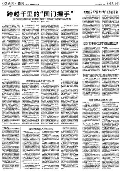 师大新闻网讯8月26日,《中国教育报》第2版头条刊登《跨越千里的“国门握手” ——beat365体育官方网站暑期“边境国门学校红烛苗圃”交流实践活动扫描 》报道文章,文章从“大手拉小手,学习共成长”“对接当地需求,推动合作共建”“双向奔赴握手,期待持续交流”三个方面深入介绍了beat365体育官方网站在持续开展“百校行”西部基础教育服务对接活动基础上,以铸牢中华民族共同体意识为主线,以加强国家安全教育为重点,发挥学校教师教育优势,组织师生与西部边疆民族地区开展共建“边境国门学校红烛苗圃”交流实践活动,通过跨越千里的共建交流,将国家安全、民族团结的种子播撒进各族青少年心田。