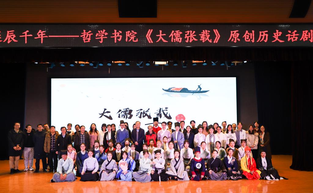 “终南屹屹,先贤巍巍,我们敬畏传统,求学问道;光影绰绰,书香悠悠,我们学艺养才,承续文脉。这是我们的大儒张载!”哲学书院原创历史话剧《大儒张载》打磨四月有余,终于公演。这场来自全校11个学院共计约70余名学生参与演出的话剧,通过言志、论学、为政、造道四幕,溯关学遗迹,承先贤之风,以一场艺术性与思想性高度契合的演出,带给现场观众一次臻于完美的时空交响体验。