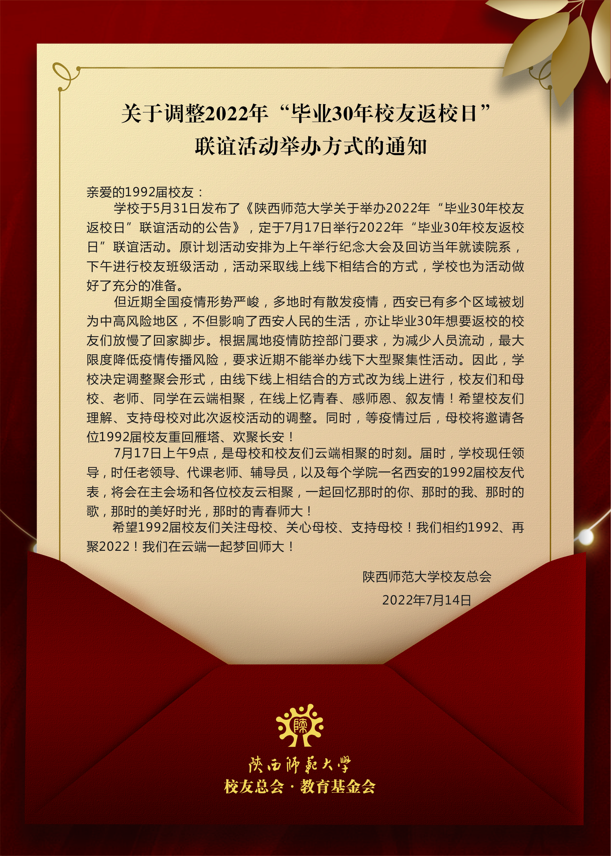 关于调整2022年“毕业30年校友返校日”联谊活动举办方式的通知