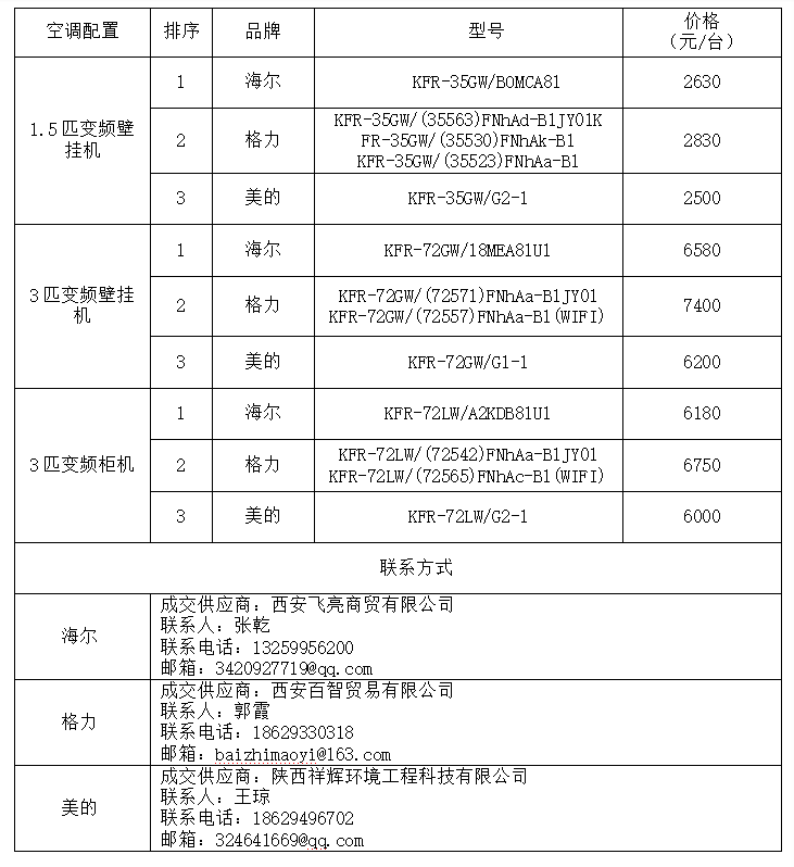 空调设备品牌、型号、价格及成交供应商信息如下: