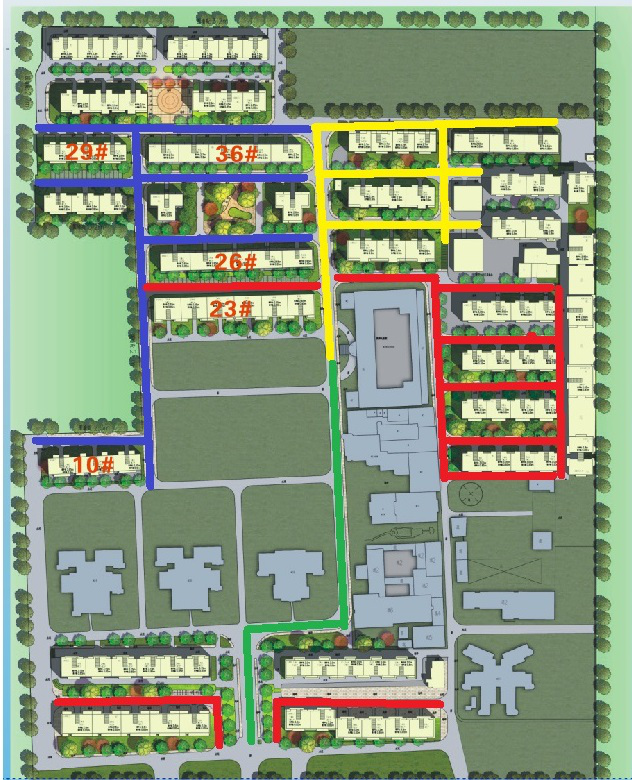 黄(家属27、32、37、38楼和专家1、2楼周边道路,校医院西侧主干道北段) |