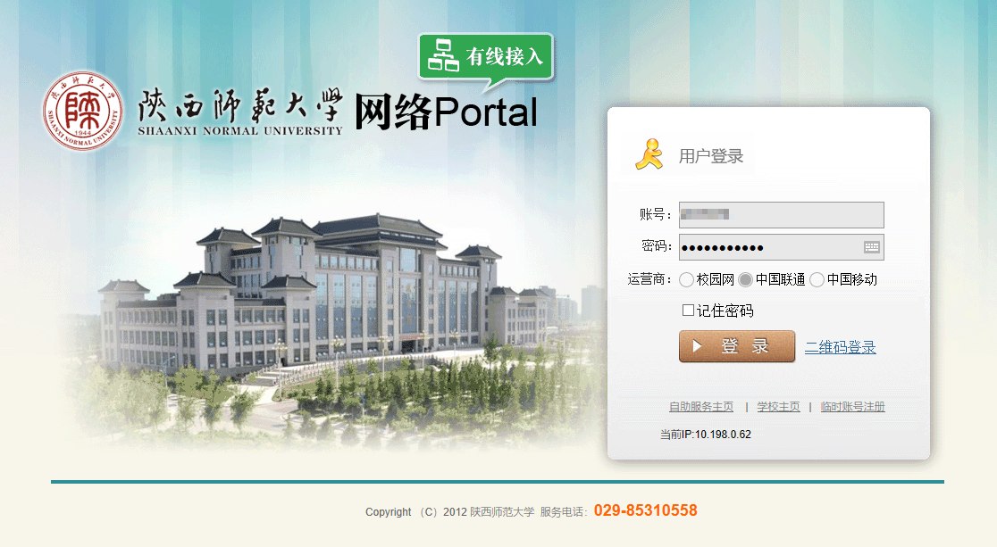 在上网认证登录页面(http://net.snnu.edu.cn),包含“校园网”,“中国联通”,“中国移动”三个选项,其中“中国联通”和“中国移动”为“代拨”上网。在登录框输入校园网账号,选择“中国联通”或“中国移动”,点击登录后将会自动绑定运营商账号上网(运营商上网账号办理及资费详见页面提示信息)