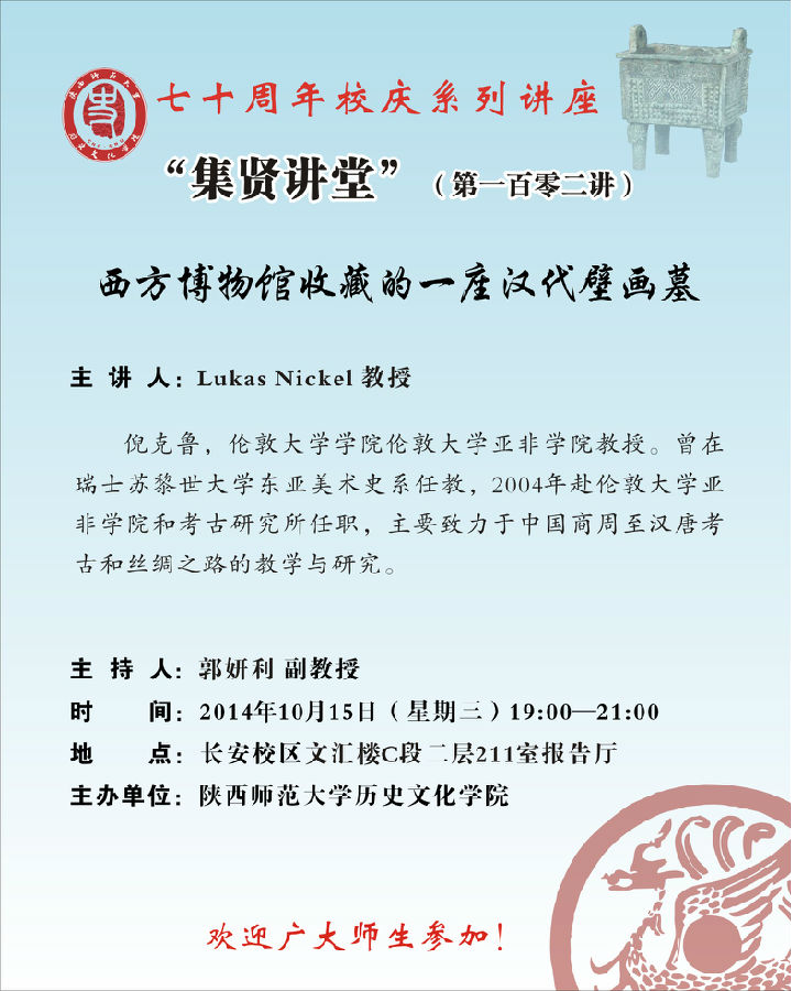 讲座题目:历史文化学院迎70周年校庆系列学术讲座之集贤讲堂102讲:西方博物馆收藏的一座汉代壁画墓