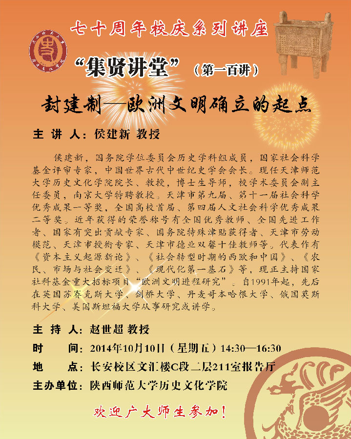 讲座题目:迎70周年校庆系列学术讲座之集贤讲堂百期:封建制—欧洲文明确立的起点