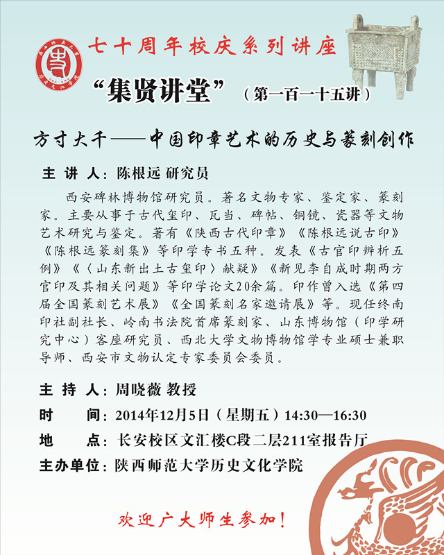 讲座题目:70周年校庆系列学术讲座之集贤讲堂115讲:方寸大千——中国印章艺术的历史与篆刻创作