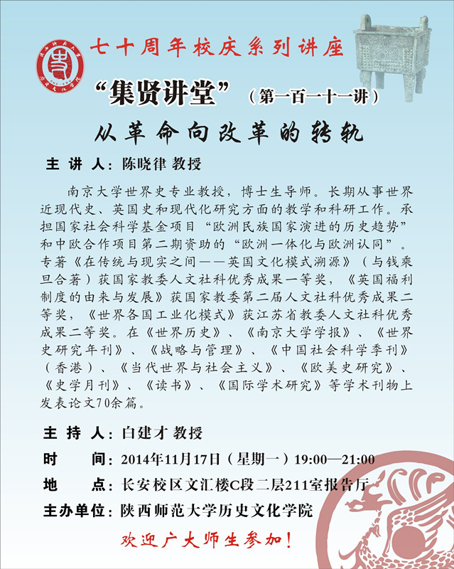 讲座题目:迎70周年校庆系列学术讲座之集贤讲堂111讲:从革命向改革的转轨