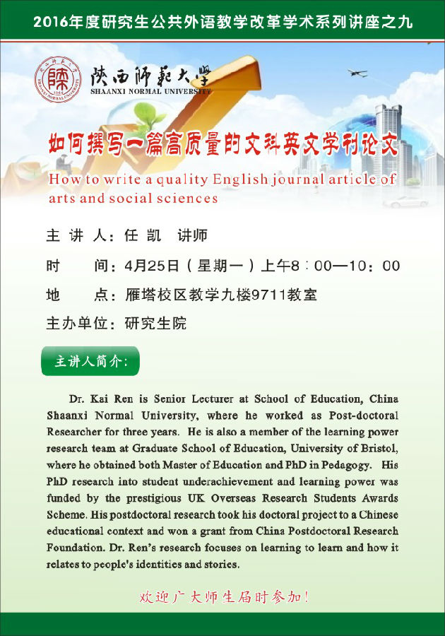 讲座题目:如何撰写一篇高质量的文科英文学刊论文