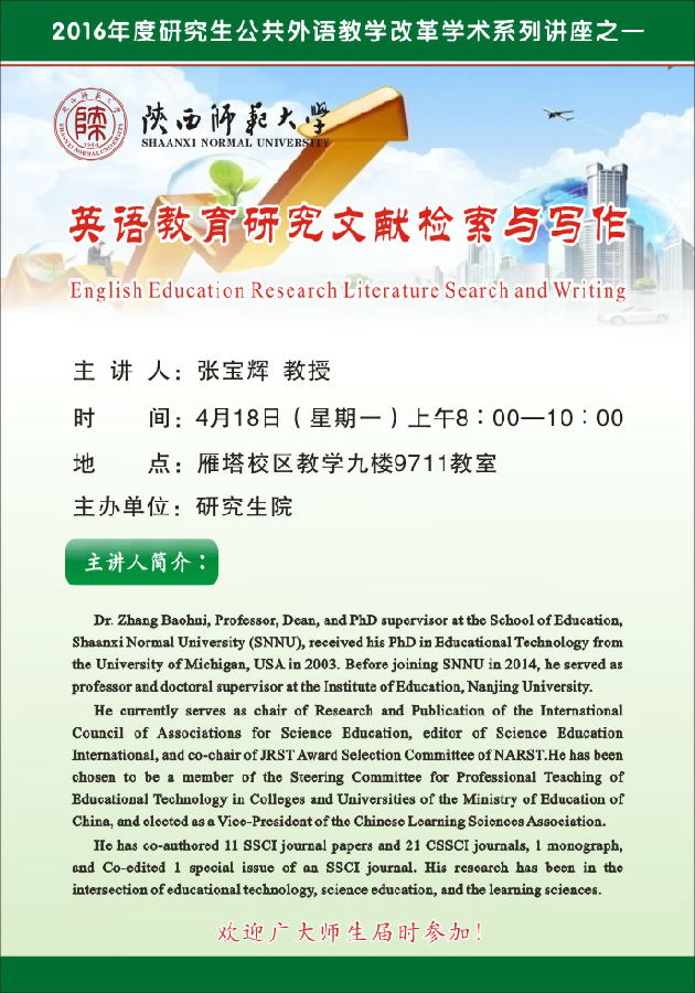 讲座题目:2016年度研究生公共外语教学改革学术系列讲座之一:英语教育研究文献检索与写作