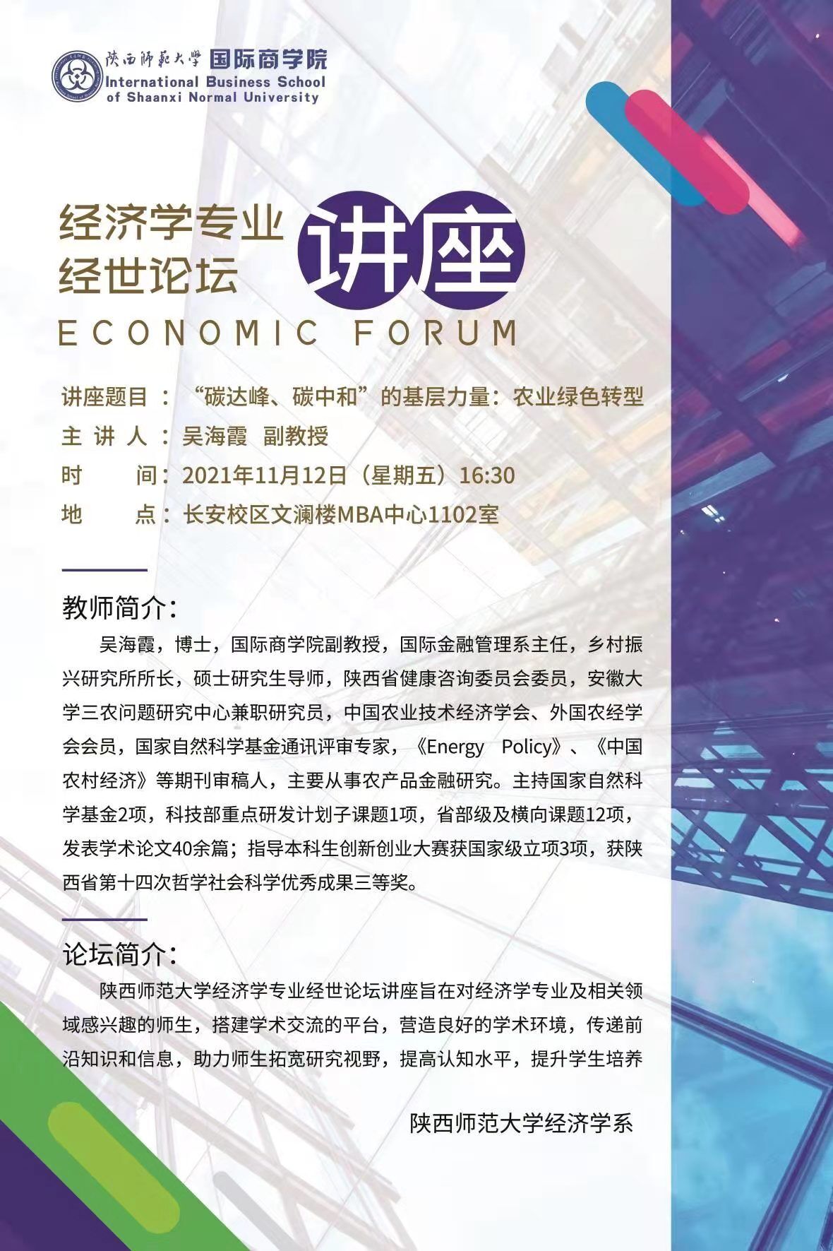 经济学专业《经世论坛》讲座——“碳达峰、碳中和”的基层力量:农业绿色转型