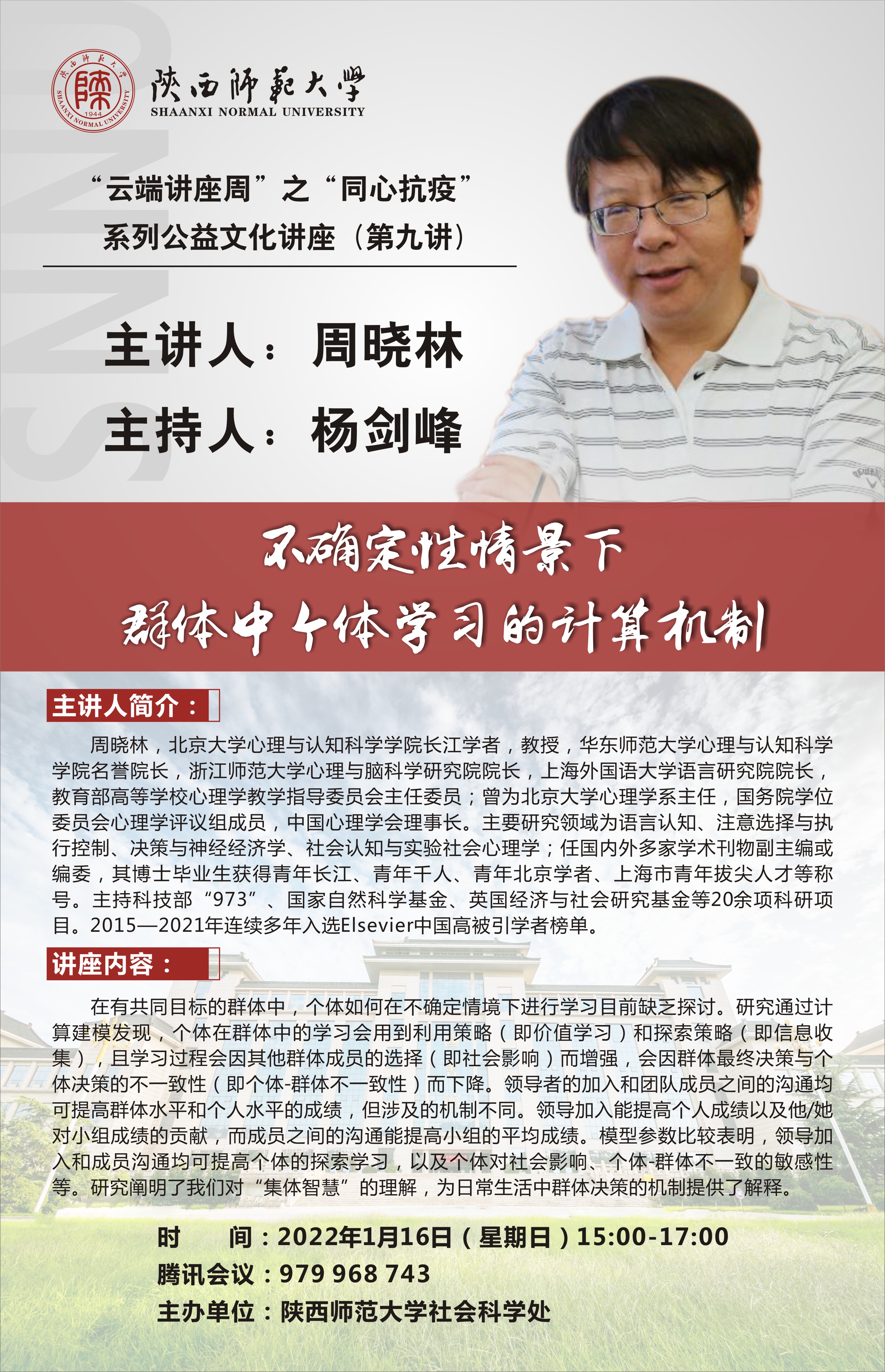 “云端讲座周”之“同心抗疫”系列公益文化讲座(第九讲):不确定性情景下群体中个体学习的计算机制