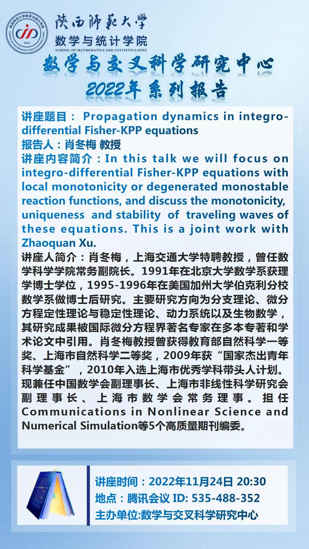 【学术活动月系列十八】Propagation dynamics in integrodifferential Fisher-KPP equations