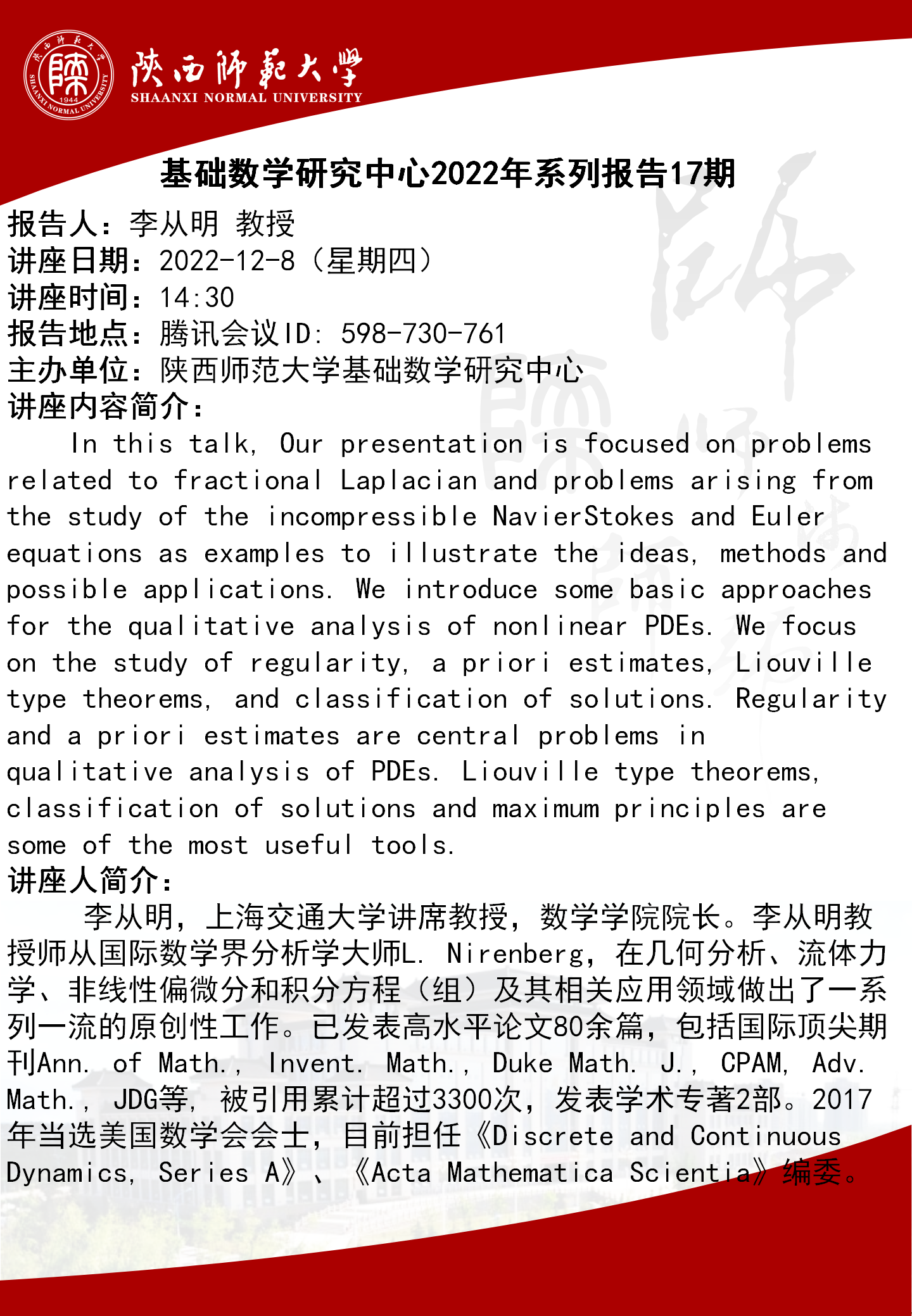 【学术活动月系列二十八】基础数学研究中心2022年系列报告17期
