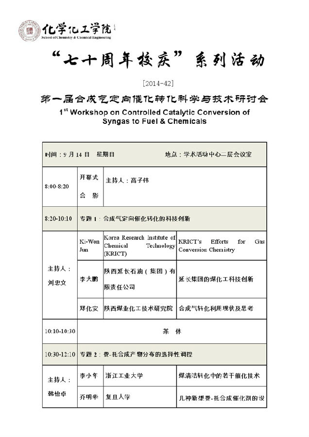 活动类别:化学化工学院“七十周年系列活动” 合成气定向催化转化科技研讨会