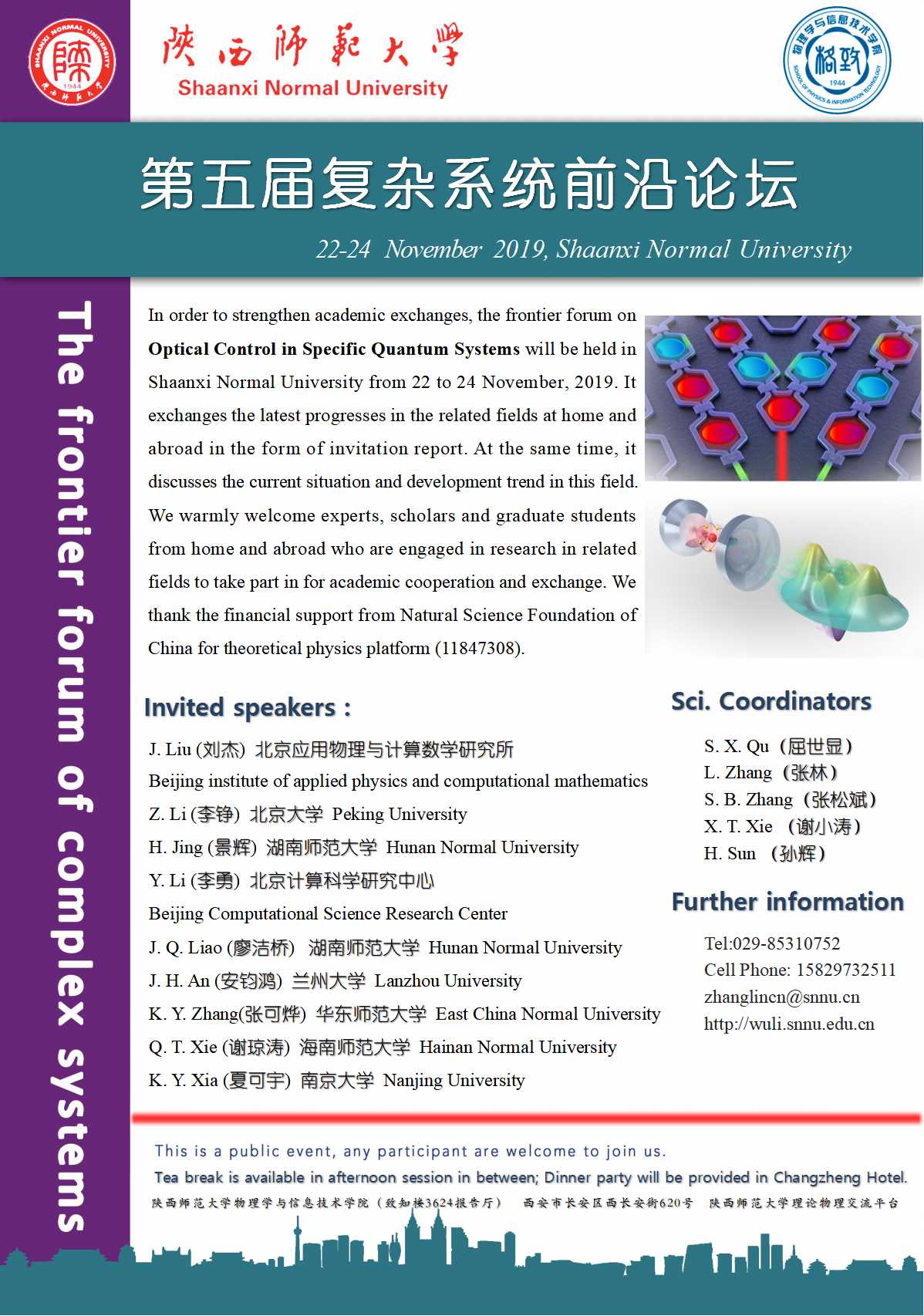 随着量子和微加工技术向纳米领域的深入,量子控制日益成为重要的研究课题。通过光学手段控制量子复杂系统动力学过程的研究表现出了更为广阔的发展前景。为加强国内外尤其是中西部地区该研究领域相关的学者之间的学术交流,在国家基金委理论物理平台专项基金支持下,光量子调控(Optical control in specific quantum systems)专题会议将于2019年11月22日至24日在beat365体育官方网站长安校区(陕西省西安市)举行。会议由beat365体育官方网站主办,会议主要以邀请报告的形式,交流和讨论在冷原子系统、光力学系统等特殊光学微系统领域光量子调控的最新进展、研究现状与发展趋势。热烈欢迎国内外从事相关领域研究的专家学者及研究生踊跃参加,合作交流!
