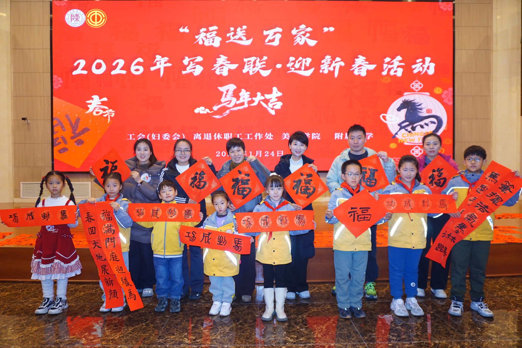 师大新闻网讯 骏马迎春送福至,翰墨飘香暖人心。1月24日下午,由工会(妇委会)、离退休职工工作处、美术学院、附属小学联合举办的“福送万家”2026年写春联迎新春活动,在长安校区新勇活动中心多功能厅举行。校内书法名家与书法爱好者齐聚一堂,挥毫泼墨,以笔墨传递温情,为师生书写新春祝福。校党委副书记卢胜利出席活动。