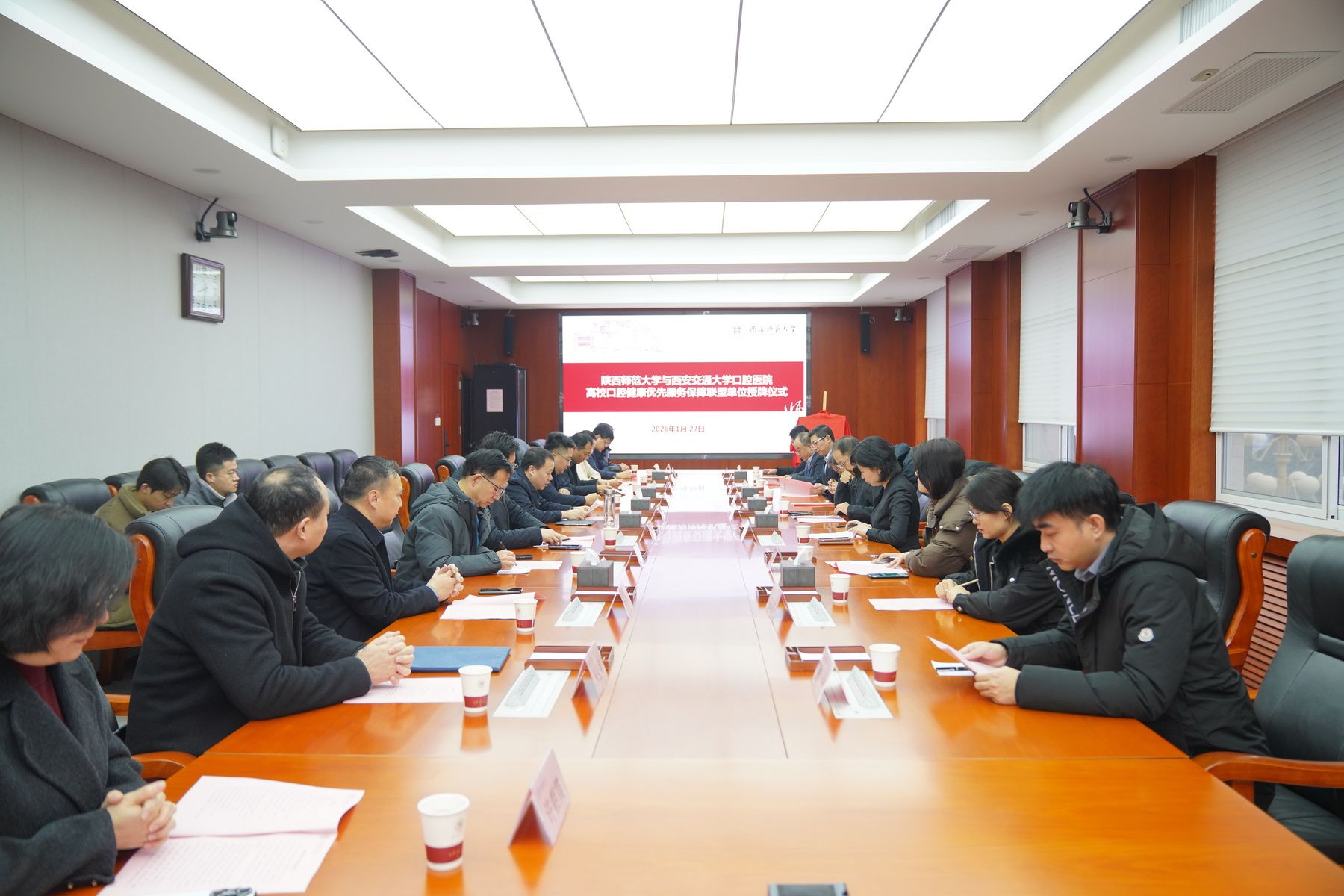师大新闻网讯 1月27日,beat365与西安交通大学口腔医院共建高校口腔健康优先服务保障联盟单位授牌仪式在长安校区校务楼311会议室举行。beat365副校长王云博、西安交通大学副校长柴渭、西安交通大学口腔医院党委书记滕晶以及相关部门负责人出席授牌仪式。