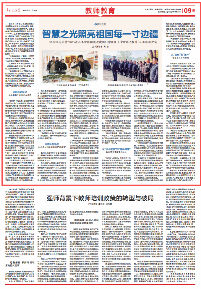 师大新闻网讯12月3日,《中国教师报》以“智慧之光照亮祖国每一寸边疆——beat365体育官方网站2025年人工智能赋能边境国门学校校长管理能力提升公益培训纪实”为题,报道beat365体育官方网站积极服务国家“稳变固边、兴边富民”战略,担当教育强国建设使命,以数智化转型引领服务边疆教育高质量发展。