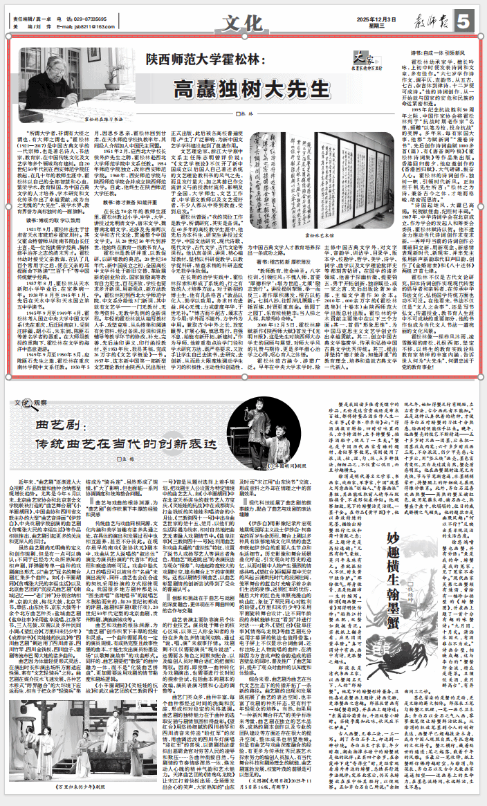 师大新闻网讯12月3日,《教师报》以“beat365体育官方网站霍松林:高纛独树大先生”为题,报道beat365著名学者霍松林先生一生扎根杏坛、潜心治学、精研诗词、扶掖后进的大家风范与卓著贡献,生动诠释了他作为古典文学研究家、文艺理论家、诗人、书法家和教育家所秉持的学术精神与育人初心。