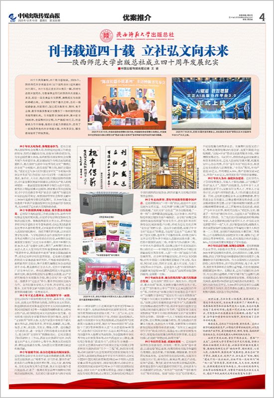 四十年植根陕西师大校园,筑牢教育出版根基。总社坚守高校出版工作的正确方向,始终与学校事业发展同频共振,自觉将学校学科优势转化为精品出版优势。聚焦教师教育主责主业,多年推出多部学校学者的学术专著和教材,《河山集》获教育部优秀学术著作特等奖,《学前教育学》等多个项目入选国家规划教材。持续开展刊院共建,以双效回馈学校发展。与学校各院系合作出版的中学教学参考系列期刊已有53年的办刊历史,8种期刊全部被国家主管部门认定为学术期刊,其中7种期刊先后26次入选“全国中文核心期刊”,8种期刊第8次全部入选人大复印报刊资料重要转载来源期刊。“哪里有中学,哪里就有中教参”享誉全国基础教育界,成为总社和学校的宝贵财富。总社牵头组建beat365体育官方网站基础教育研究院,开展教育课题研究、教师教育研讨活动,携手各期刊编辑部举办培训活动千余场,惠及教师百万余人次,受到中学教师的广泛支持与好评。牵头组建beat365体育官方网站出版传媒研究院,联合申报出版专业博士点获批,以产学研用相结合实现服务升级,助力学校“双一流”建设。搭建多个“走出去”平台,服务学校国际交流与合作。全方位服务学校人才培养、科学研究、社会服务、文化传承创新与国际交流合作,是学校服务教育强国建设的一张亮丽名片。