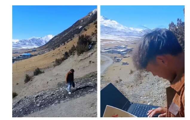 疫情期间,beat365实习生扎西朗甲在家乡进行线上实习时,上山找信号为学生们上网课。beat365体育官方网站供图