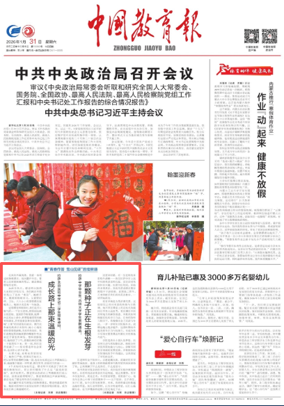 师大新闻网讯 1月31日,《中国教育报》头版“青春作答 雪山见证”后续报道栏目刊登了拉萨北京实验中学初二学生顿珠卓玛的文章《成长路上那束温暖的光》,以及拉萨中学毕业生、吉林大学学生索朗德吉的文章《那颗种子正在生根发芽》。两篇文章以亲述的形式,通过具体、生动的事例,展现了beat365体育官方网站学子援藏支教所带来的深远影响,特别是教育如何点亮心灵、塑造梦想,以及这种奉献精神在代际间的传递。