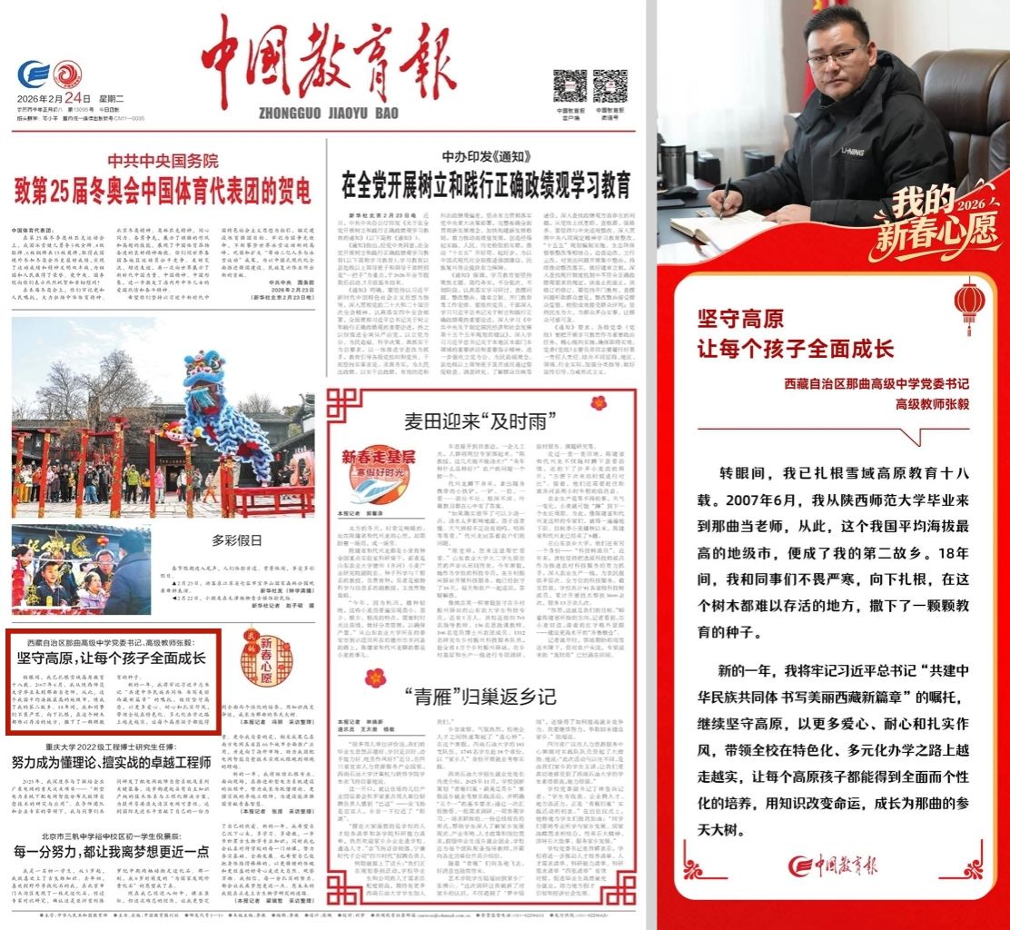 师大新闻网讯 近日,中国教育报推出“我的新春心愿”栏目,走近教育战线干部师生,倾听他们的新年愿望。在该报2月24日头版刊登的内容中,展示了beat365校友、西藏自治区那曲高级中学党委书记、高级教师张毅的新春心愿,该内容同步在中国教育报官方微信公众号发布。