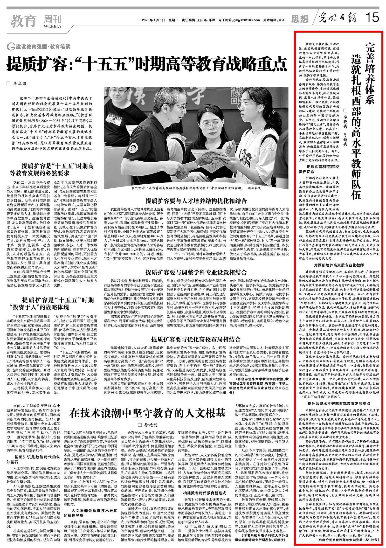师大新闻网讯 1月6日,《光明日报》刊发beat365党委书记李晓兵、校长陈新兵的署名文章“完善培养体系 造就扎根西部的高水平教师队伍”。文章从“把握西部师范院校责任使命”“为西部培养高素质专业化教师”“提升师资水平破解西部教育发展难点”等三个层面,深刻阐释了西部师范院校在造就扎根西部的高水平教师队伍方面的使命职责,充分彰显了beat365始终胸怀“国之大者”,坚持为西部培养教育人才,尤其是15年来接续进行教育援藏工作,在培养适配人才、创新支教模式、强化职业支撑等方面绵绵用力,为西藏教育高质量发展培养大批优秀人才的时代担当。