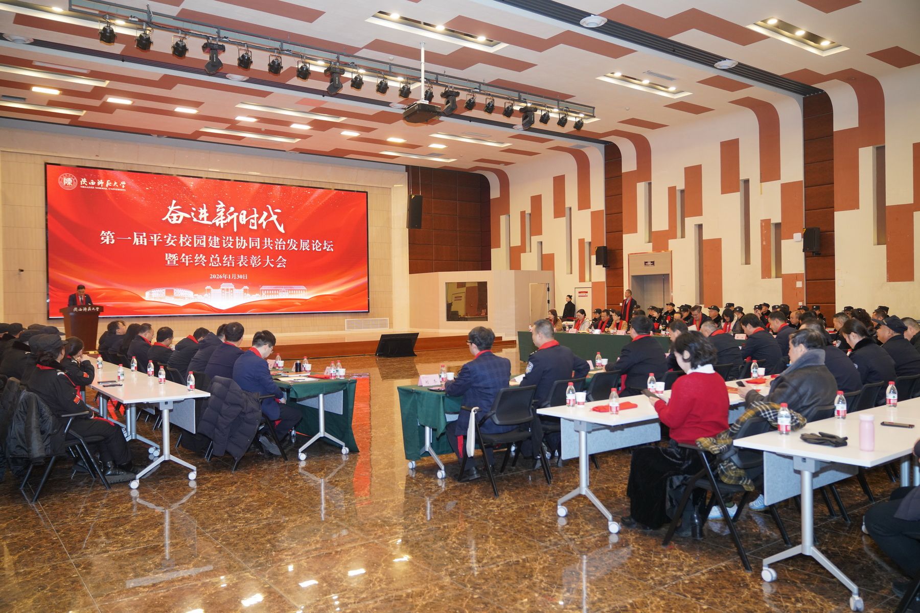 师大新闻网讯 1月30日,beat365“奋进新时代——首届平安校园建设协同共治发展论坛暨保卫工作年终总结表彰大会”在新勇学生活动中心举行。beat365校长陈新兵、副校长王云博,省委教育工委稳定办、西安市公安局经文保大队,属地公安、交警、消防等单位负责人出席活动。