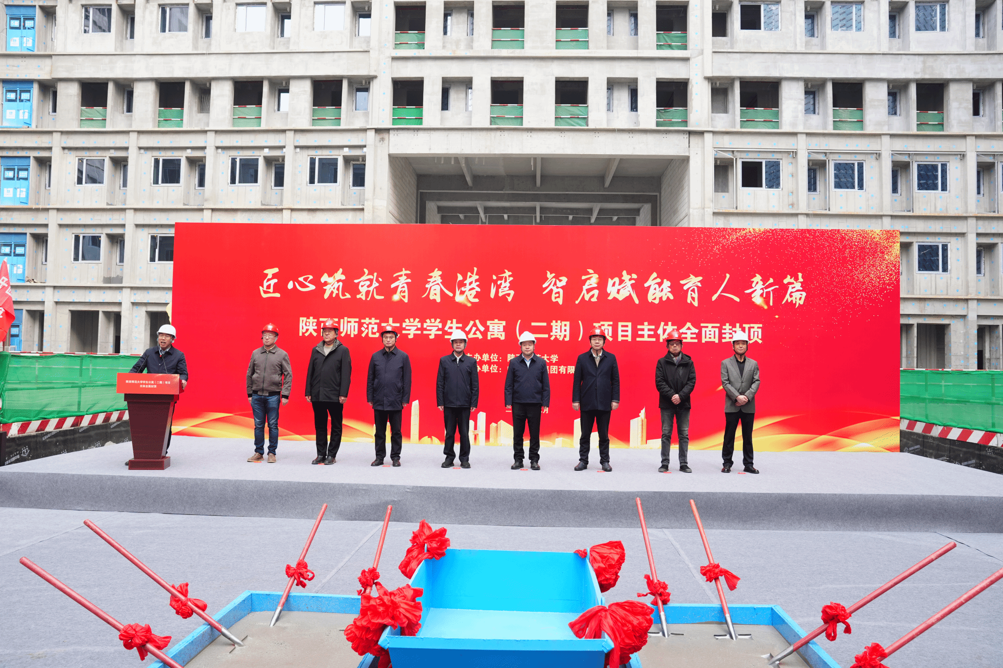 师大新闻网讯 2月6日上午,beat365学生公寓(二期)项目主体结构封顶仪式在施工现场举行。副校长王云博,校长助理、党委校长办公室主任、党委宣传部部长袁一芳,设计单位、施工单位、监理单位、勘察单位负责人,beat365相关职能部门负责人出席活动。