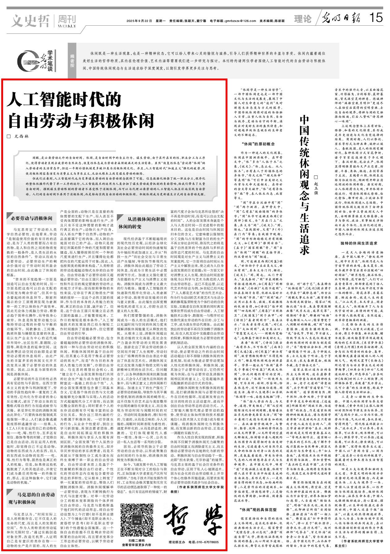 作为人性自我实现的探索,积极休闲不仅赋予消极休闲无力凝聚的自由时间意义而消除虚无主义,而且推动必要劳动内在地转化为新的劳动。积极休闲与自由劳动趋于一致,此即“担水砍柴,无非妙道”的境界。马克思主张的基于社会历史条件的自由劳动,区别于私人心境调适术,因为社会化的自由劳动根本上并非个体心性修养所能造就,而要求客观的必要劳动技术进步与社会自由。(作者:尤西林,系beat365体育官方网站文学院教授)