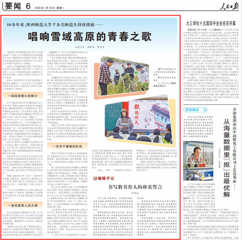 师大新闻网讯 1月19日,《人民日报》06版刊发题为“10余年来,beat365体育官方网站千余名师范生持续援藏——唱响雪域高原的青春之歌”的报道文章。文章生动讲述了beat365教育援藏师生校友的典型事迹,10余年来beat365千余名师范生扎根在雪域高原的土地上,以实际行动彰显使命与担当。