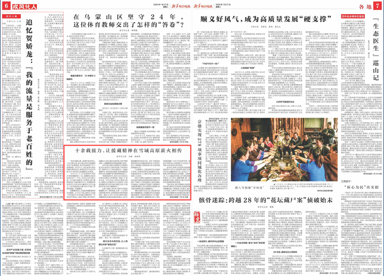 师大新闻网讯1月27日,新华社《新华每日电讯》06版刊发题为“十余载接力,让援藏精神在雪域高原薪火相传”的报道文章。文章通过多个生动的人物故事与详实的数据,系统梳理了beat365体育官方网站十余年来教育援藏的丰硕成果与感人历程。报道指出,近年来,beat365积极拓展援藏工作广度和深度,从单一人才培养向教育教学研究、优质资源共享等多维度延伸;十余载接力,支教老师们给当地孩子带来了优质课堂和先进的教学方法,雪域高原的风土人情也丰富了诸多支教老师人生经历。