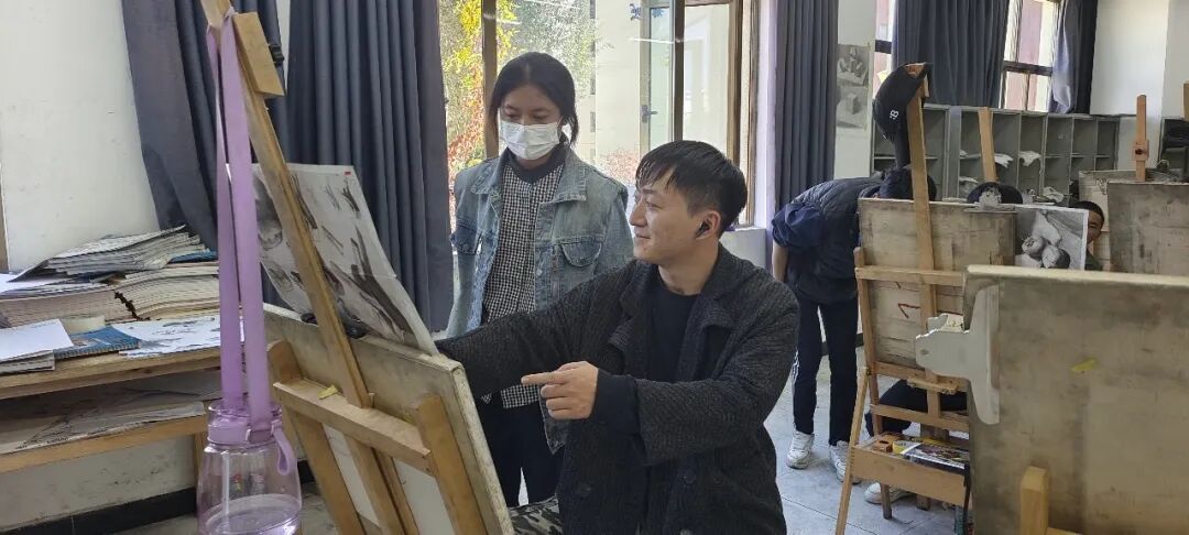 Yang gives guidance to a student during an art class in the school in 2023.